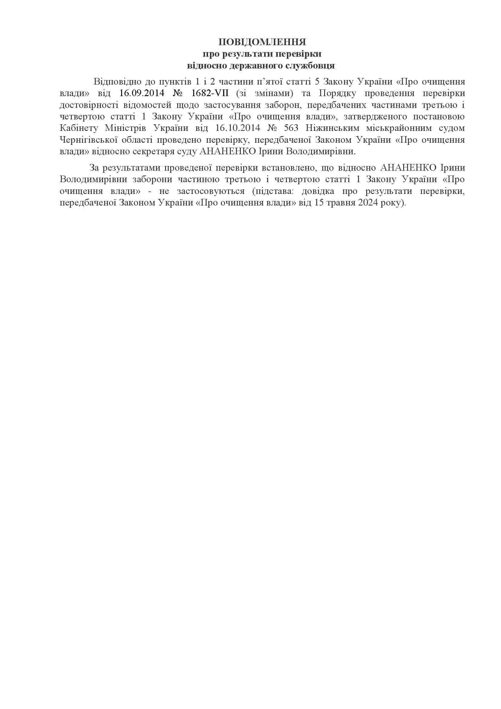 Повідомлення про проходження перевірки відносно Ананенко І.В.