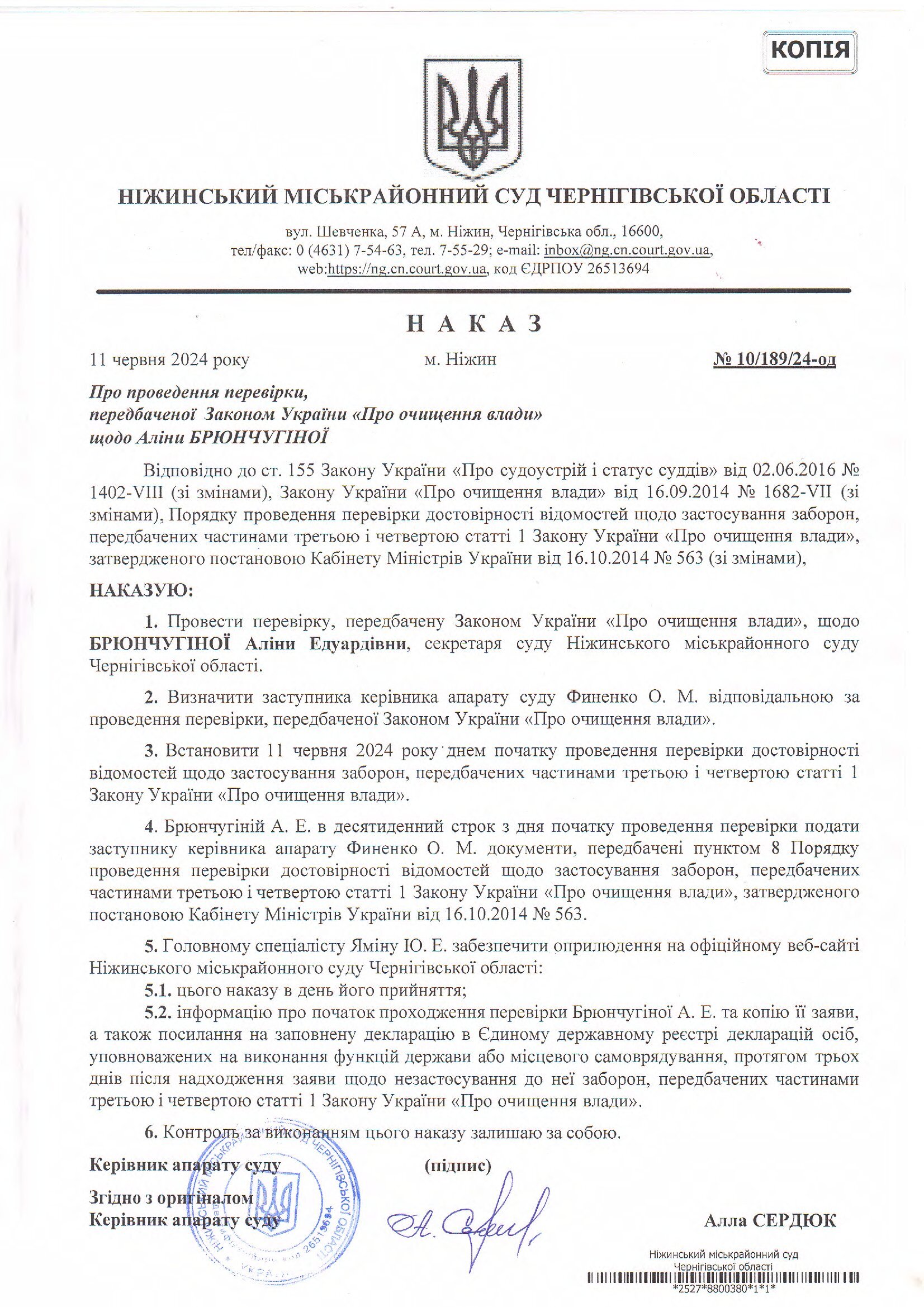 Наказ про проведення перевірки, передбаченої Законом України Про очищення влади щодо Брюнчугіної А.Е.