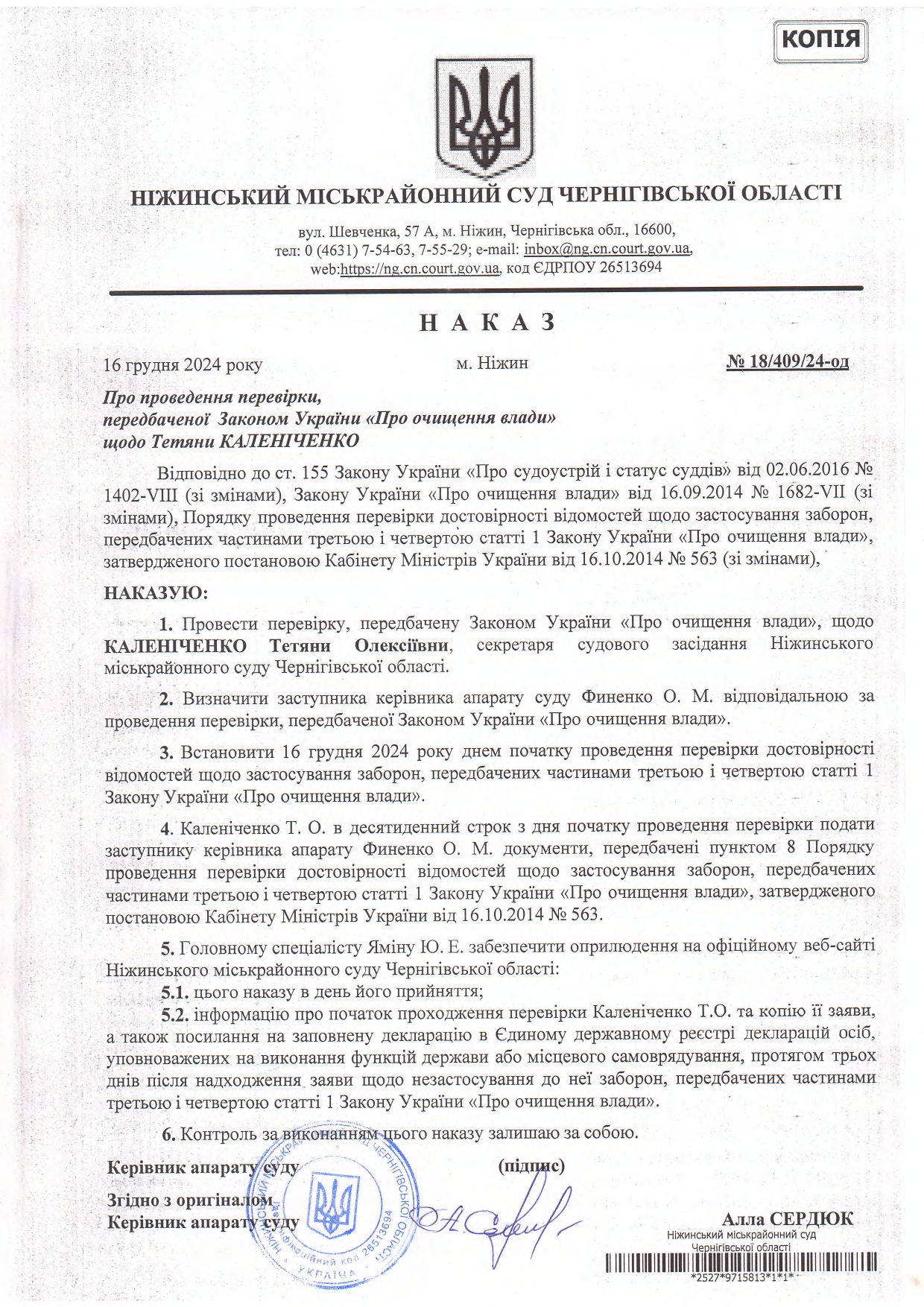 Наказ про проведення перевірки, передбаченої Законом України "Про очищення влади" щодо Каленіченко Т.О.