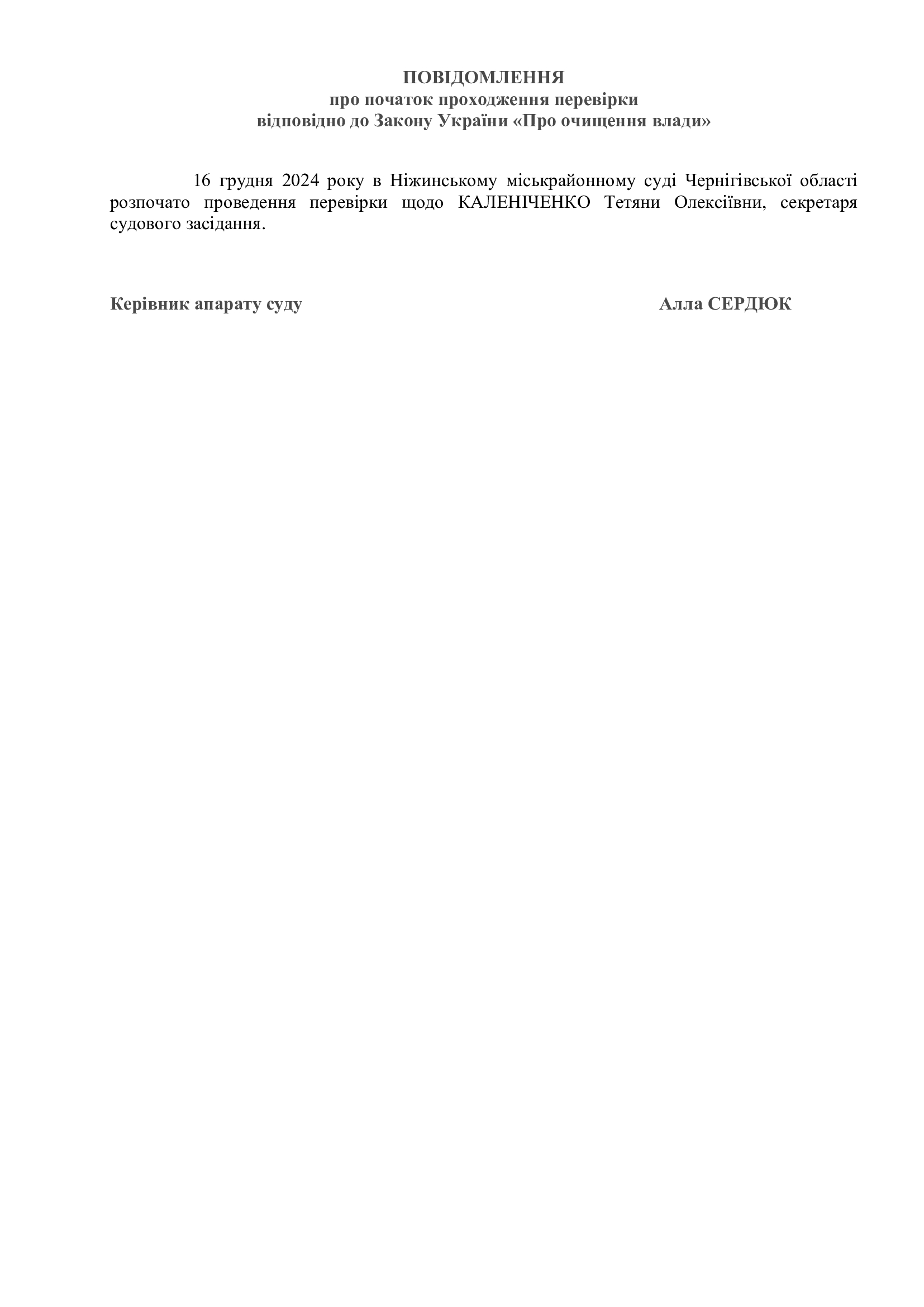 Повідомлення про проходження перевірки відносно Каленіченко Т.О. відповідно до Закону України "Про очищення влади"