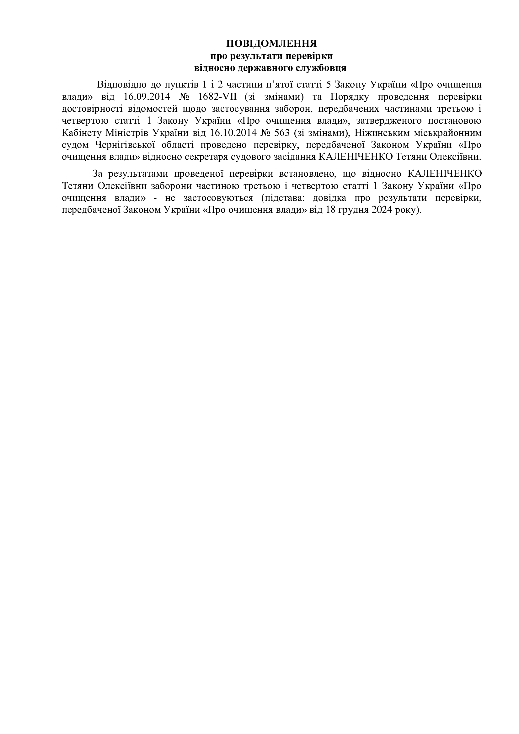 Повідомлення про результати перевірки відносно Каленіченко Т.О.