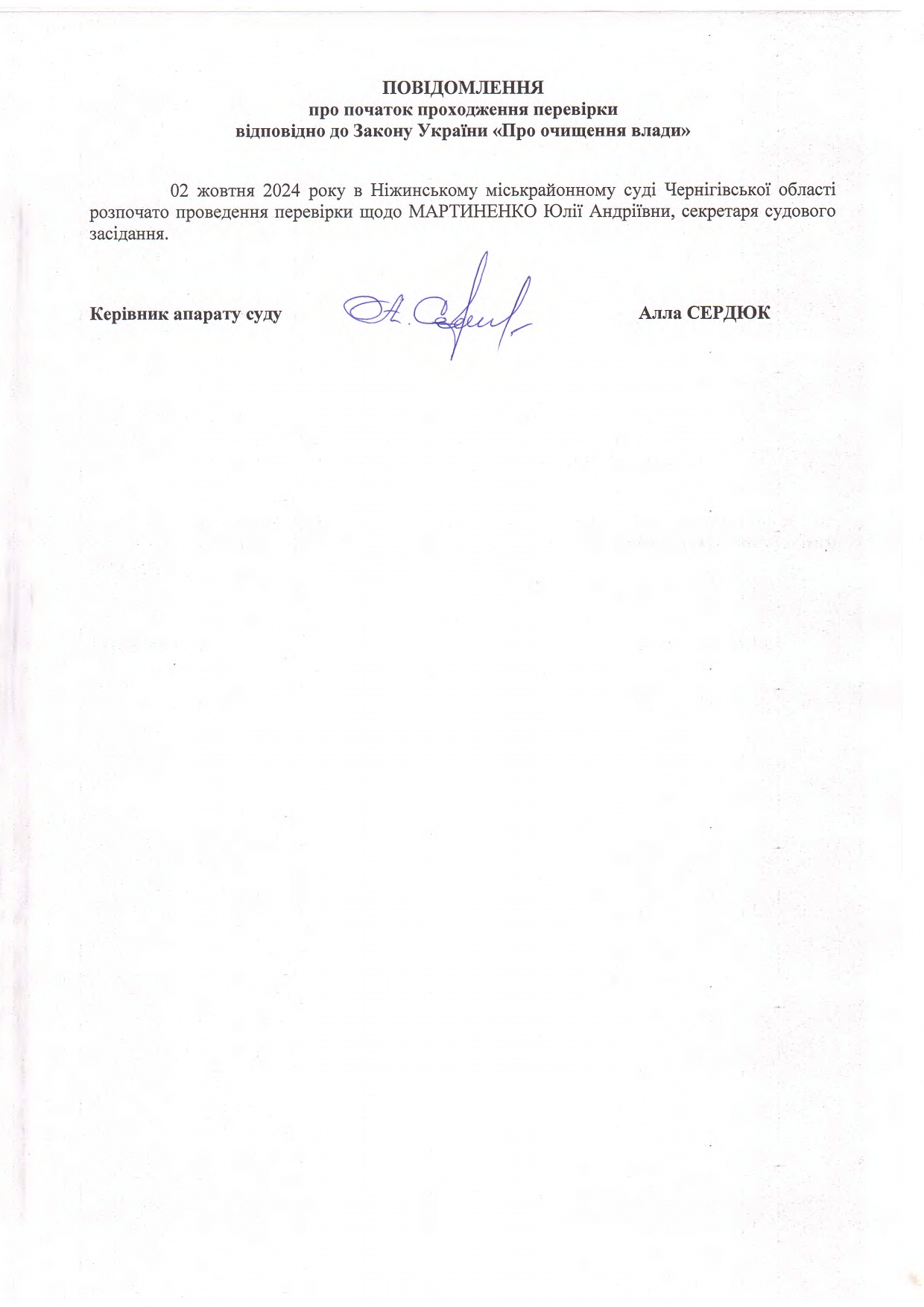 Повідомлення про проходження перевірки відносно Мартиненко Ю.А. відповідно до Закону України "Про очищення влади"