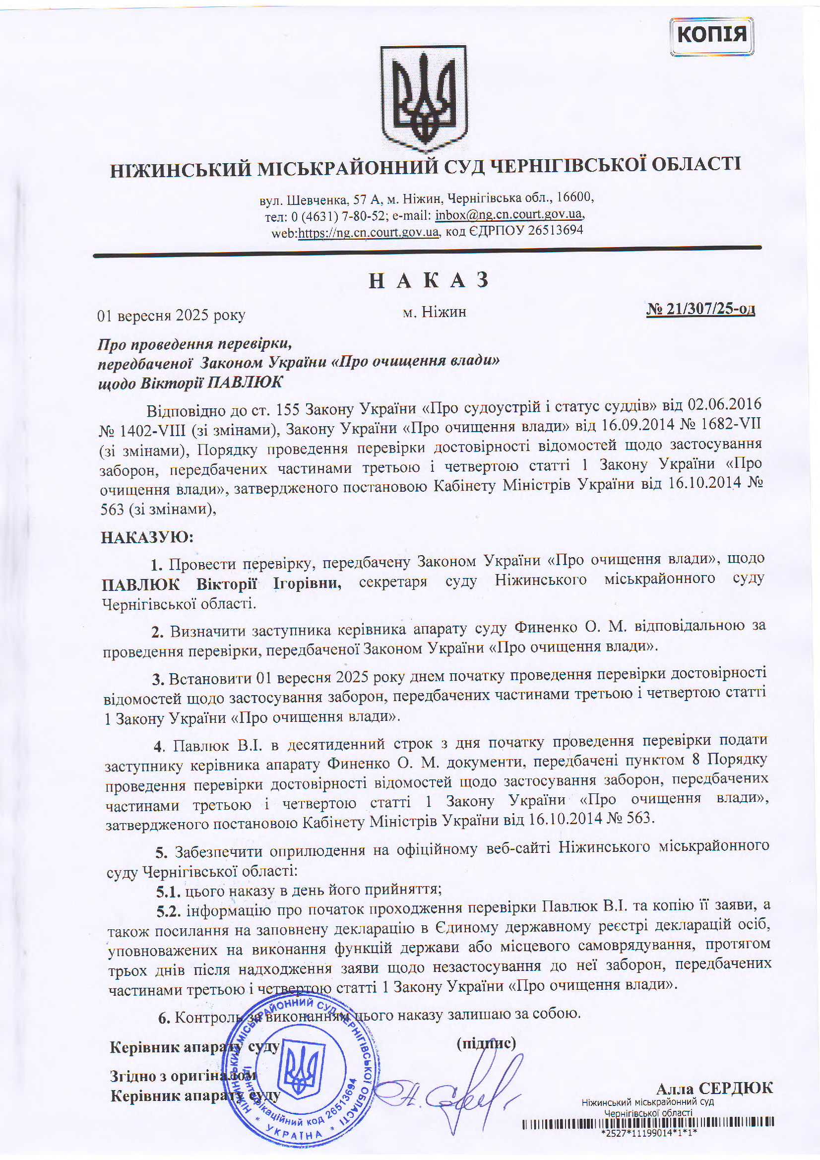 Наказ про проведення перевірки, передбаченої Законом України Про очищення влади щодо Павлюк В.І..