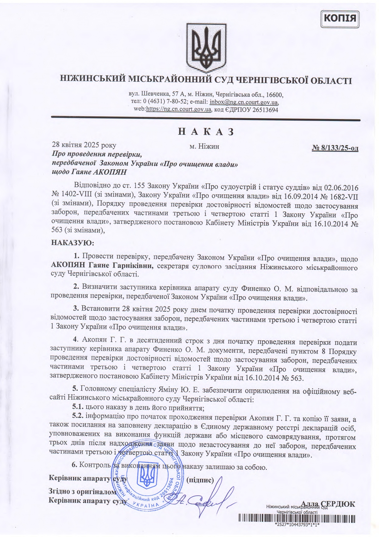 Наказ про проведення перевірки, передбаченої Законом України Про очищення влади щодо Акопян Г.Г.