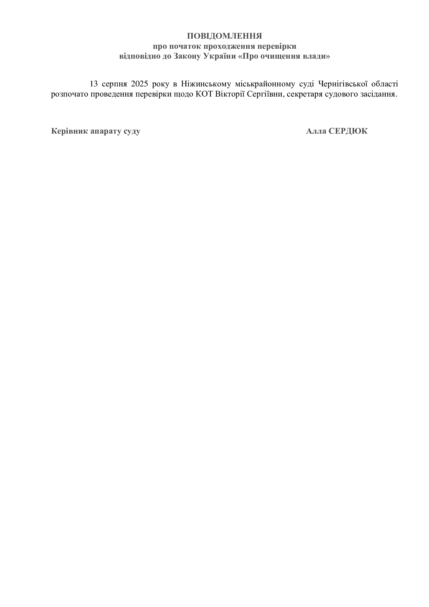 Повідомлення про проходження перевірки відносно Кот В.С.відповідно до Закону України "Про очищення влади"