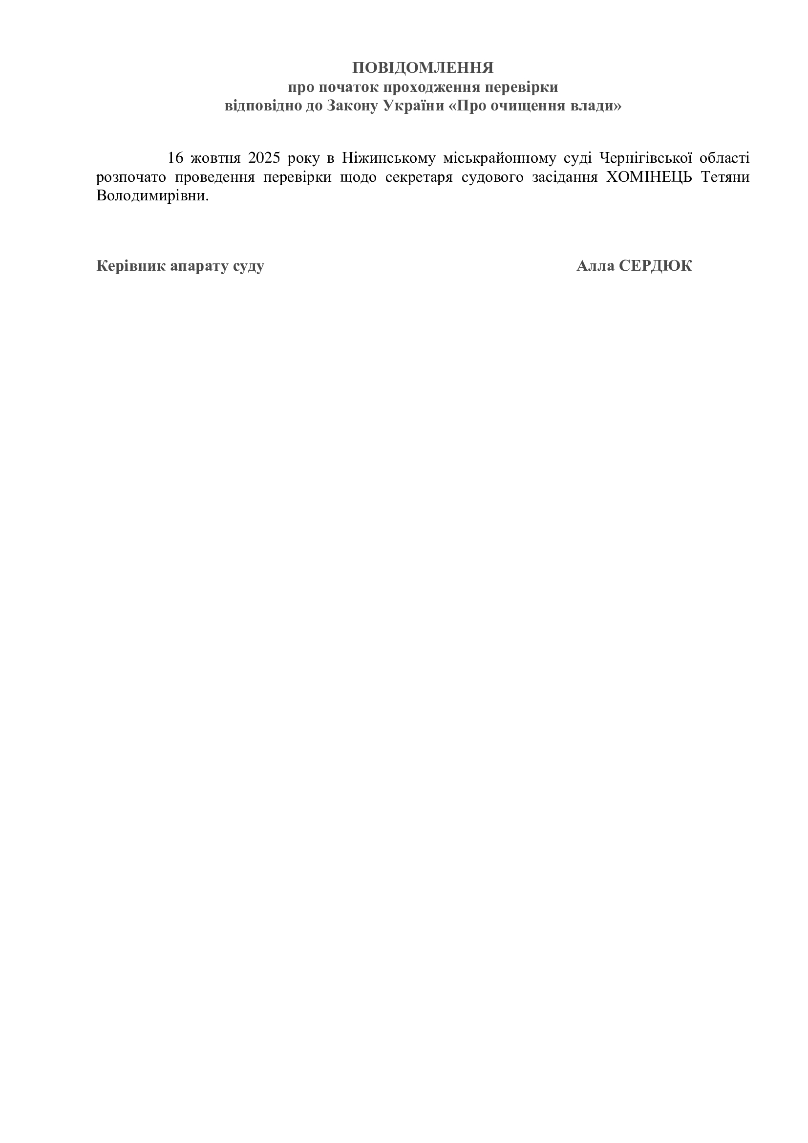 Повідомлення про проходження перевірки відносно Хомінець Т.В. відповідно до Закону України "Про очищення влади"