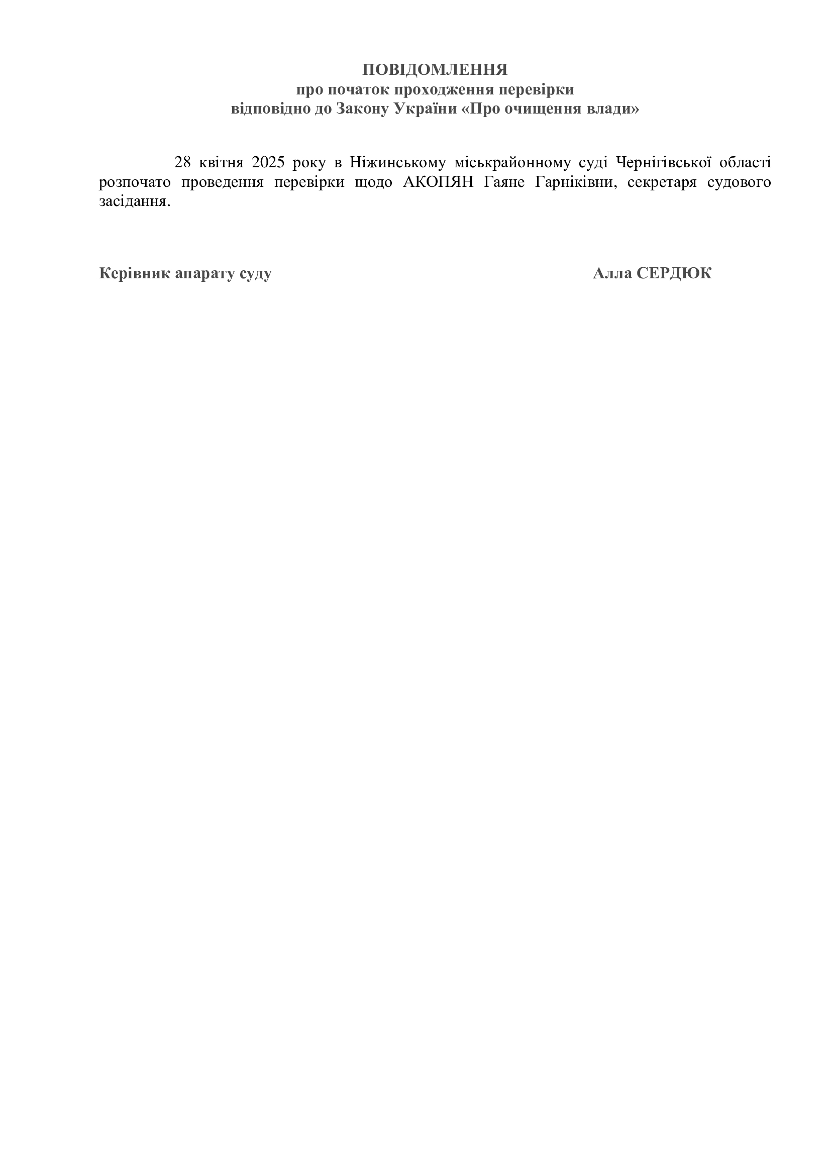 Повідомлення про проходження перевірки відносно Акопян Г.Г.відповідно до Закону України "Про очищення влади"
