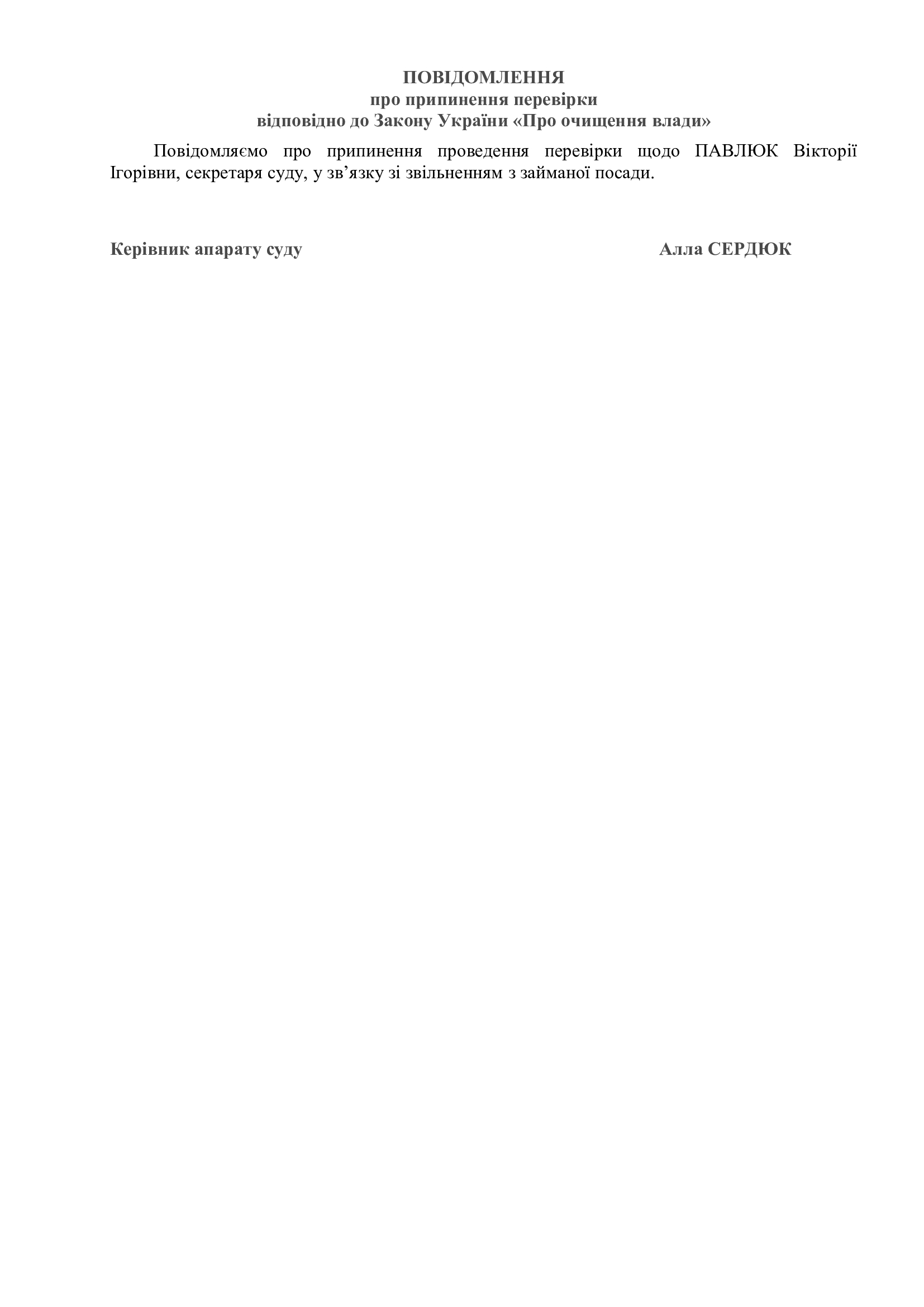 Повідомлення про припинення перевірки відповідно до Закону України «Про очищення влади» стосовно Павлюк В.І.