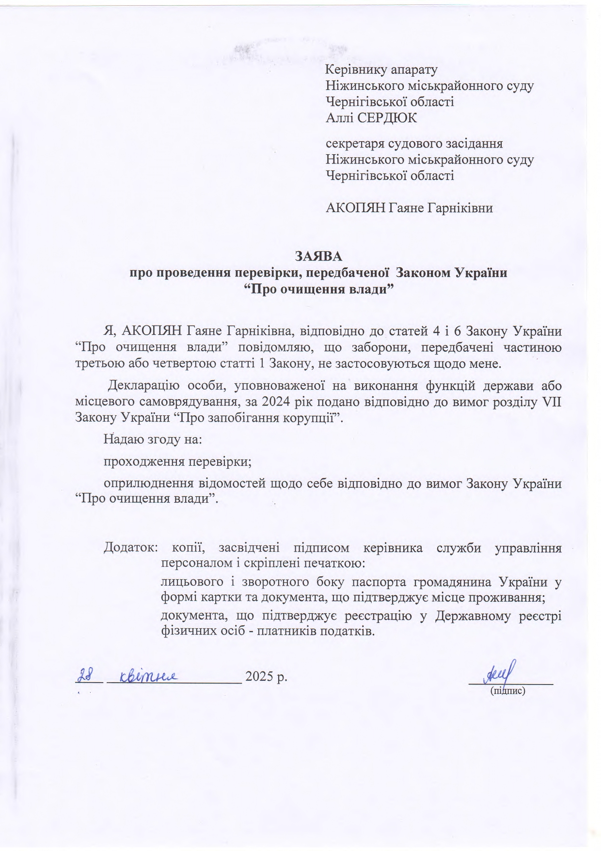 Заява Акопян Г.Г. про проведення перевірки, передбаченої Законом України "Про очищення влади"