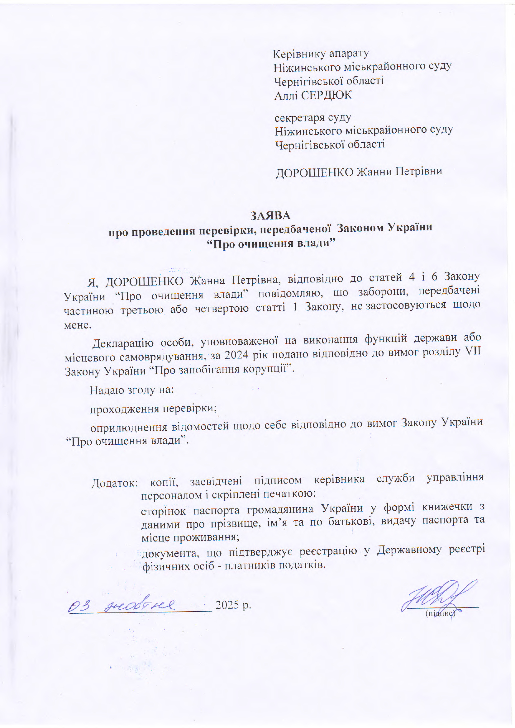 Заява Дорошенко Ж.П. про проведення перевірки, передбаченої Законом України "Про очищення влади"