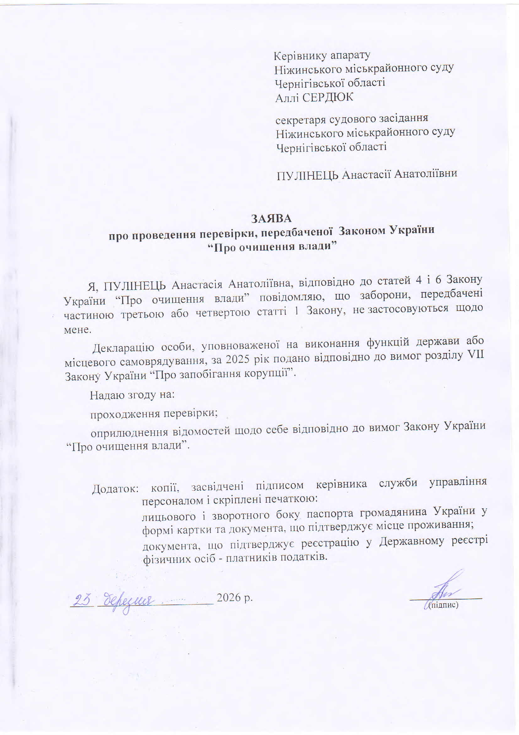 Заява Пулінець А.А. про проведення перевірки, передбаченої Законом України "Про очищення влади"