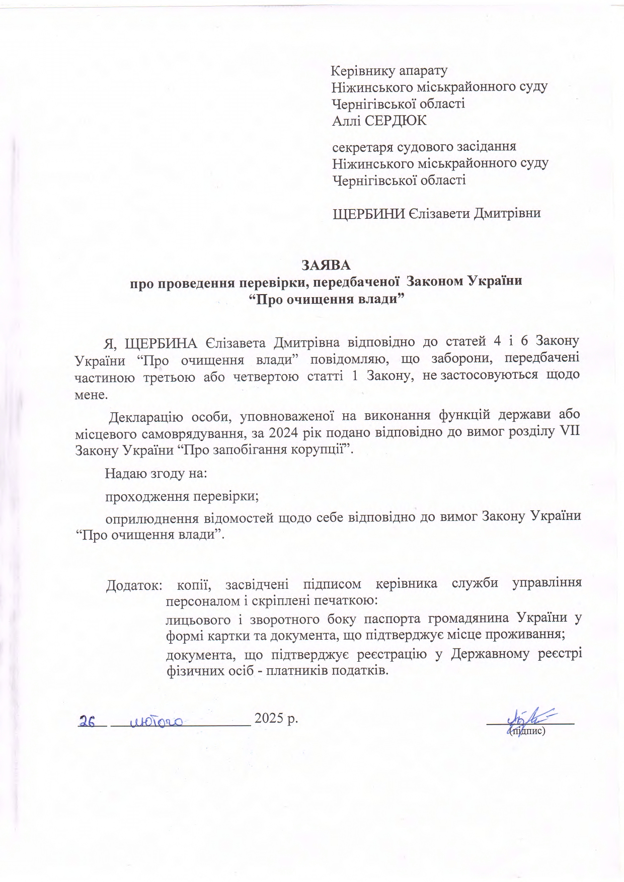 Заява Щербини Є.Д. про проведення перевірки, передбаченої Законом України "Про очищення влади"