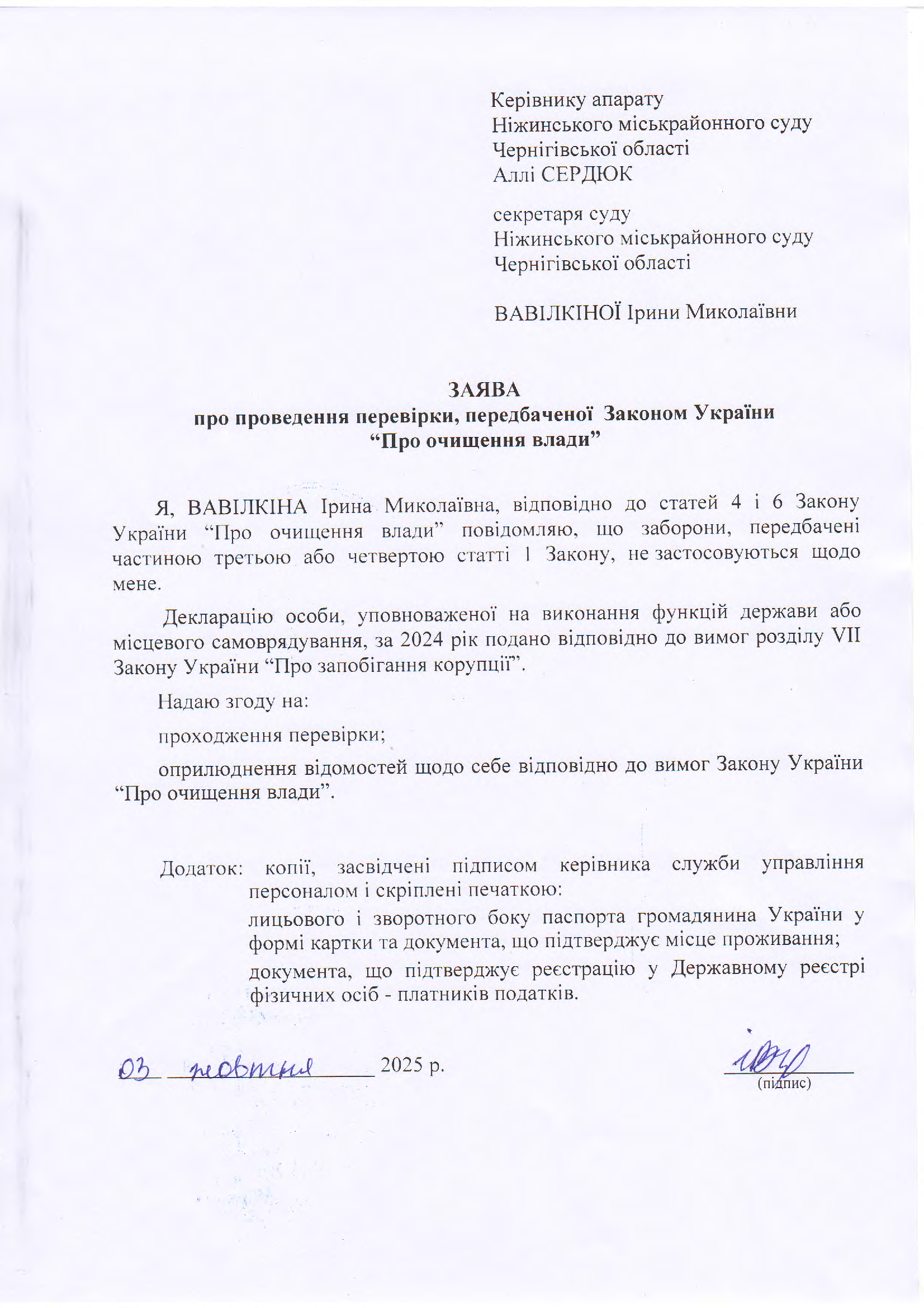 Заява Вавілкіної І.М. про проведення перевірки, передбаченої Законом України "Про очищення влади"
